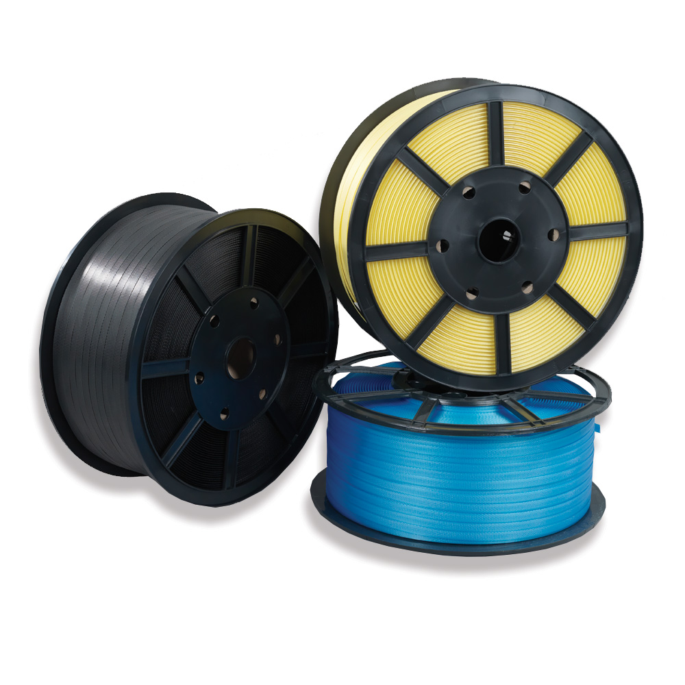 This plastic reel strapping is applied by hand and should be used with a dispenser.