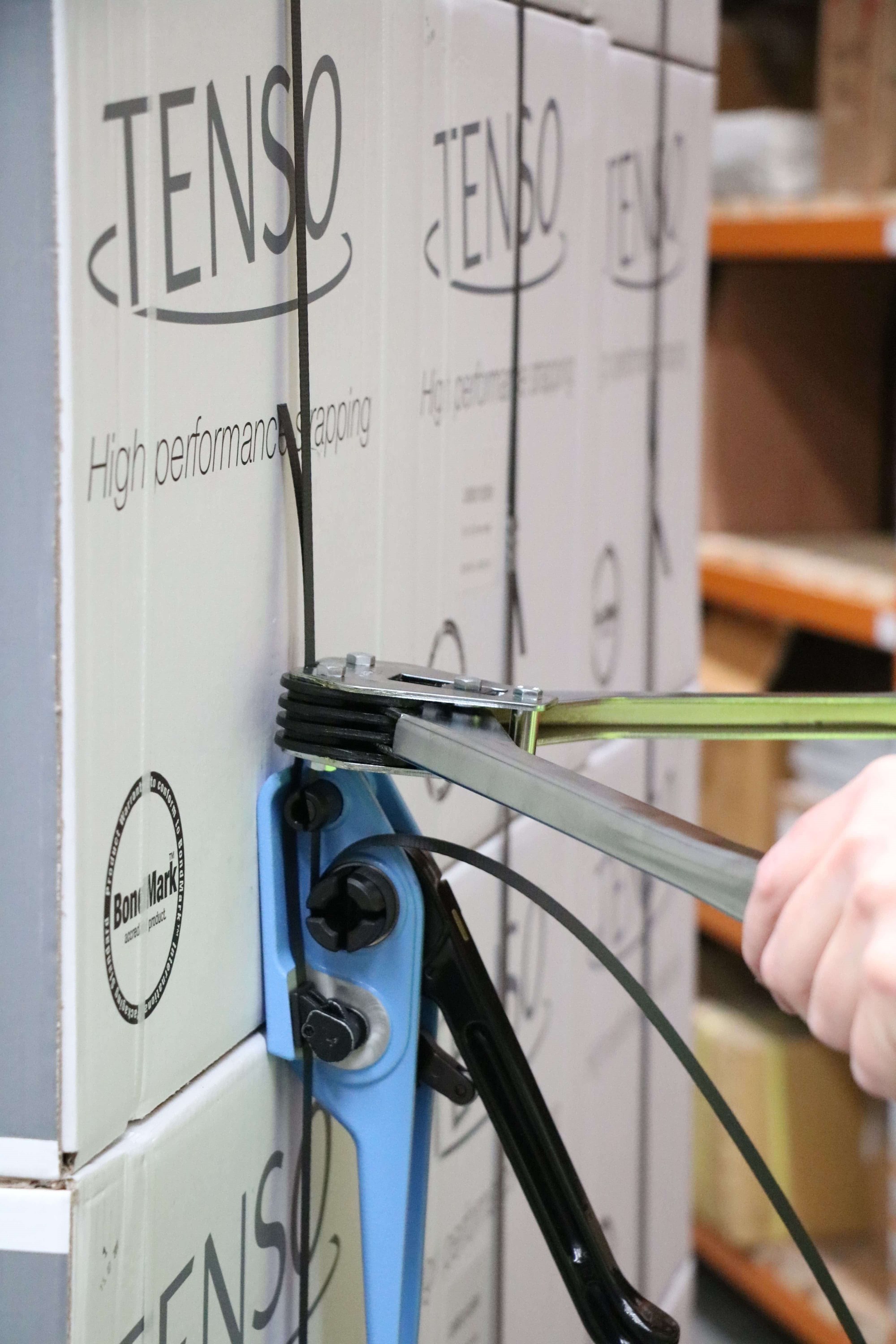 Applies semi-open metal seals to polypropylene straps to give a strong hold and keep the strapping secure.